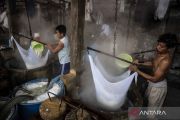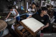 Sejumlah pekerja mengolah kedelai impor untuk bahan baku tahu di Sentra Industri Tahu LS, Candisari, Semarang, Jawa Tengah, Rabu (16/4/2025). Kementerian Usaha Mikro, Kecil, Menengah (UMKM) mencatat pencapaian realisasi Kredit Usaha Rakyat (KUR) pada triwulan pertama 2025 telah mencapai Rp57,51 triliun, yang disalurkan kepada kurang lebih 1,014 juta debitur di seluruh Indonesia. ANTARA FOTO/Aprillio Akbar/YU