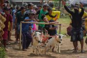 Peserta melepas kambing agar berlari saat lomba karapan kambing di lapangan Kelurahan Jrebeng Kulon, Kecamatan Kedopok, Probolinggo, Jawa Timur, Sabtu (19/4/2025). Karapan kambing yang diikuti 96 peserta tersebut digelar oleh Komunitas Pecinta Budaya Karapan Probolinggo dalam rangka menjaga tradisi dan termasuk dalam rangkaian Festival Budaya Kerapan Probolinggo. ANTARA FOTO/Irfan Sumanjaya/foc.