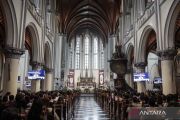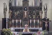 Suasana Misa Hari Raya Paskah Pontifikal di Gereja Katedral, Jakarta, Minggu (20/4/2025). Misa Hari Raya Paskah itu mengangkat tema Kepedulian Lebih Kepada Saudara yang Lemah dan Miskin. ANTARA FOTO/Dhemas Reviyanto/YU