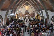 Umat Katolik mengikuti ibadah Misa Hari Raya Paskah di Gereja Katolik Paroki Roh Kudus Babakan, Badung, Bali, Minggu (20/4/2025). Sebagian besar umat Katolik di gereja tersebut mengenakan busana adat Bali pada perayaan Paskah sebagai simbol akulturasi dan pelestarian budaya guna menjaga harmonisasi. ANTARA FOTO/Nyoman Hendra Wibowo/YU
