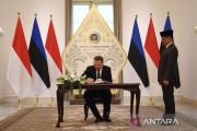 Menteri Luar Negeri Sugiono (kanan) menyaksikan Menteri Luar Negeri Estonia Margus Tsahkna (kiri) mengisi buku tamu sebelum pertemuan bilateral di Jakarta, Rabu (23/4/2025). Pertemuan itu untuk mempererat hubungan bilateral kedua negara serta menjajaki peluang kerja sama di bidang perdagangan, ekonomi, dan digitalisasi. ANTARA FOTO/Akbar Nugroho Gumay/tom.