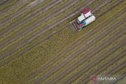 Foto udara petani memanen padi menggunakan mesin Combine Harvester di areal persawahan Amohalo, Kecamatan Baruga, Kendari, Sulawesi Tenggara, Sabtu (26/4/2025). Badan Pusat Statistik (BPS) mencatat capaian produksi beras secara nasional hingga 28 Februari 2025 mencapai 2,23 juta ton dari target tahun 2025 sebesar 32 juta ton. ANTARA FOTO/Andry Denisah/wpa.