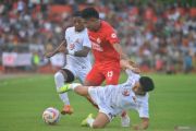 Pesepak bola Semen Padang FC Alekvan Djin (tengah) berebut bola dengan pemain Madura United, Taufanny (kanan) pada pertandingan lanjutan BRI Liga 1 di Stadion H Agus Salim Padang, Sumatera Barat, Minggu (4/5/2025). Semen Padang FC mengalahkan Madura United dengan skor 2-1 membuat tim Kabau Sirah itu untuk sementara keluar dari zona degradasi. ANTARA FOTO/Iggoy el Fitra/wpa.