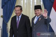 Presiden Prabowo Subianto (kanan) bersama Presiden Senat Kerajaan Kamboja Samdech Akka Moha Sena Padei Techo Hun Sen (kiri) saat kunjungan kehormatan di kompleks Istana Kepresidenan, Jakarta, Senin (5/5/2025). Kunjungan kehormatan Presiden Senat Kerajaan Kamboja ke Indonesia tersebut untuk meningkatkan kerja sama di berbagai bidang strategis antarkedua negara. ANTARA FOTO/Galih Pradipta/tom.