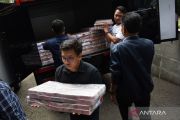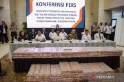Petugas membawa barang bukti uang hasil sitaan pada perkara TPPU perjudian daring saat gelar perkara di Gedung Bareskrim Polri, Jakarta, Rabu (7/5/2025). Direktorat Tindak Pidana Ekonomi Khusus Bareskrim Polri menetapkan dua orang tersangka kasus TPPU hasil judi daring dengan modus mendirikan perusahaan cangkang yang memfasilitasi transaksi pembayaran dari 12 situs judi online yakni Komisaris dan Direktur PT A2Z Solusindo Teknologi berinisial OHW dan H, serta menyita uang sebesar Rp530 miliar dan empat unit mobil. ANTARA FOTO/Indrianto Eko Suwarso/bar
