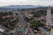 Foto udara antrean kendaraan saat diberlakukan sistem satu arah (one way) di Jalan Raya Puncak, Gadog, Kabupaten Bogor, Jawa Barat, Senin (12/5/2025). Pada libur panjang Hari Raya Waisak, cuti bersama serta libur akhir pekan, kawasan wisata Puncak dipadati kendaraan wisatawan sehingga Satlantas Polres Bogor menerapkan rekayasa arus lalu lintas sistem satu arah (one way) dari arah Jakarta menuju Puncak untuk mengurai kemacetan kendaraan. ANTARA FOTO/Yulius Satria Wijaya/YU