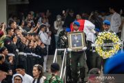 Prajurit TNI mengusung peti jenazah almarhum tokoh Pencak Silat Dunia atau dikenal Bapak Pencak Silat Dunia Mayjen TNI (Purn) Eddie Mardjoeki Nalapraya untuk dimakamkan dari Padepokan Pencak Silat TMII di Jakarta, Selasa (13/5/2025). Pendiri Persukutuan Pencak Silat Antarbangsa (Persilat) pada 1980 itu wafat di usia 93 tahun dan akan dimakamkan di Taman Makam Pahlawan Kalibata. ANTARA FOTO/Bayu Pratama S/bar