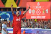 Pesepak bola Semen Padang FC Bruno Gomes berselebrasi usai membobol gawang Persik Kediri pada pertandingan lanjutan BRI Liga 1 di Stadion H Agus Salim Padang, Sumatera Barat, Minggu (18/5/2025). Tim Kabau Sirah menahan imbang Persik Kediri dengan skor 1-1 sehingga posisinya masih belum aman dari zona degradasi klasemen sementara. ANTARA FOTO/Iggoy el Fitra/nym.