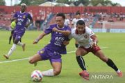 Pesepak bola Persik Kediri Dede Sapari (kiri) berebut bola dengan pesepak bola Borneo FC Samarinda Leo Guntara (kanan) pada pertandingan Liga 1 di Stadion Brawijaya, Kota Kediri, Jawa Timur, Jumat (23/5/2025). Borneo FC Samarinda mengalahkan Persik Kediri dengan skor 2-1. ANTARA FOTO/Prasetia Fauzani/Spt.