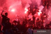Suporter menyalakan flare dan petasan usai pertandingan Liga 1 antara Persik Kediri melawan Borneo FC Samarinda di Stadion Brawijaya, Kota Kediri, Jawa Timur, Jumat (23/5/2025). Borneo FC Samarinda mengalahkan Persik Kediri dengan skor 2-1. ANTARA FOTO/Prasetia Fauzani/Spt.