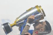 Pemain dan ofisial tim Persib Bandung mengangkat piala usai pemberian piala Liga 1 di Stadion Gelora Bandung Lautan Api (GBLA), Bandung, Jawa Barat, Sabtu (24/5/2025). Tim Persib Bandung menjuarai liga 1 musim 2024/2025 dengan raihan 69 poin. ANTARA FOTO/Raisan Al Farisi/rwa.