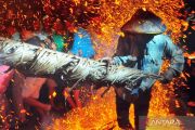 Peserta menggunakan obor untuk menyerang lawan saat tradisi perang obor di Desa Tegalsambi, Tahunan, Jepara, Jawa Tengah, Senin (9/6/2025). Tradisi tahunan perang obor yang diikuti sebanyak 40 orang peserta itu merupakan puncak sedekah bumi desa setempat yang dilaksanakan sebagai wujud syukur masyarakat kepada Tuhan Yang Maha Esa atas rezeki melimpah, kesehatan serta keselamatan. ANTARA FOTO/Yusuf Nugroho/bar