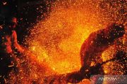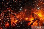 Peserta saling serang menggunakan obor saat tradisi perang obor di Desa Tegalsambi, Tahunan, Jepara, Jawa Tengah, Senin (9/6/2025). Tradisi tahunan perang obor yang diikuti sebanyak 40 orang peserta itu merupakan puncak sedekah bumi desa setempat yang dilaksanakan sebagai wujud syukur masyarakat kepada Tuhan Yang Maha Esa atas rezeki melimpah, kesehatan serta keselamatan. ANTARA FOTO/Yusuf Nugroho/bar