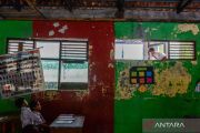 Siswa melihat kondisi ruang kelasnya yang rusak di SD Negeri Binangun, Kabupaten Serang, Banten, Selasa (10/6/2025). Sebanyak lima ruang kelas di sekolah tersebut mengalami kerusakan dengan kondisi sebagian atap ruang kelas ambruk sejak tahun 2019 sehingga para siswa khawatir saat proses kegiatan belajar mengajar dapat tertimpa atap yang ambruk akibat kayu yang sudah lapuk. ANTARA FOTO/Muhammad Bagus Khoirunas/bar