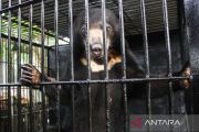 Seekor beruang madu (Helarctos malayanus) berada di dalam kandang transit Balai Konservasi Sumber Daya Alam (BKSDA) Kalimantan Tengah, Palangka Raya, Rabu (11/6/2025). BKSDA Kalteng menerima seekor beruang madu berusia sekitar tiga tahun serahan dari warga Kota Palangka Raya dan satwa dilindungi tersebut akan direhabilitasi sebelum dilepasliarkan ke habitatnya. ANTARA FOTO/Auliya Rahman/tom.