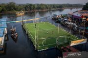 Foto udara anak-anak bermain bola di Lapangan Apung Bela Negara, Muara Angke, Jakarta, Rabu (25/6/2025). Pembangunan fasilitas yang digagas Kementerian Pertahanan (Kemenhan) bersama Universitas Pertahanan (Unhan) tersebut bertujuan menyediakan ruang publik serbaguna dan olahraga untuk mendukung peningkatan kualitas hidup warga pesisir. ANTARA FOTO/Bayu Pratama S/wpa.