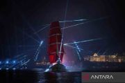 Sebuah kapal berlayar di Sungai Neva saat perayaan Scarlet Sails Festival di St. Petersburg, Rusia, Minggu (29/6/2025). ANTARA FOTO/Xinhua/An Xiaomeng/rwa.