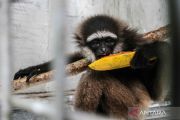 Seekor Owa (Hylobates Albibarbis) yang diserahkan oleh warga berada di dalam kandang trasnsit Balai Konservsi Sumber Daya Alam (BKSDA) Kalimantan Tengah, Palangka Raya, Kamis (3/7/2025). BKSDA Kalteng menerima Owa berjenis kelamin jantan berusia sekitar dua tahun dalam keadaan sehat yang sempat dipelihara warga Kota Palangka Raya untuk direhabilitasi sebelum dilepasliarkan ke habitatnya. ANTARA FOTO/Auliya Rahman/YU