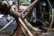 Pekerja mengampelas batang pohon pinang di Pinang, Kota Tangerang, Banten, Senin (11/8/2025). Penjualan pohon pinang untuk perlombaan panjat pinang dalam rangka memeriahkan peringatan HUT Kemerdekaan RI tersebut mulai marak dijual dengan harga Rp1 juta - Rp1,5 juta per buah yang dipasarkan ke sejumlah wilayah Jabodetabek. ANTARA FOTO/Putra M. Akbar/nz