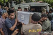 Sejumlah warga dan kerabat mengangkat peti jenazah yang merupakan calon siswa (casis) bintara TNI AD Muhammad Dehan setibanya di kediaman Kelurahan Tabona, Ternate, Maluku Utara, Selasa (12/8/2025). Pihak keluarga mendapatkan informasi anak mereka meninggal pada Senin (11/8) pukul 07.00 WIT saat mengikuti pendidikan militer di Pusat Pendidikan Infantri (Pusdikif) Cipatat Bandung, Jawa Barat diduga terjatuh di kamar mandi dan bakal dilantik sebagai prajurit TNI pada 7 September 2025. ANTARA FOTO/Andri Saputra/bar
