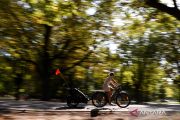 Seorang warga mengendarai sepeda saat gelombang panas melanda Vienna, Austria, Kamis (14/8/2025). Gelombang panas yang melanda Austria hingga mencapai suhu 36 derajat Celcius di berbagai daerah menyebabkan pemerintah mengeluarkan peringatan darurat kepada warga untuk mengantisipasi suhu tinggi yang terjadi. ANTARA FOTO/Xinhua/He Canling/bar