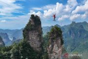 Atlet slackline asal Brazil Coutinho melintasi dua bukit dengan berjalan di atas seutas tali saat mengikuti Kejuaraan Dunia Slackline King 2025 di Zhangjiajie, Provinsi Hunan, China, Senin (18/8/2025). Kejuaraan tersebut diikuti 20 atlet slackline elit yang berasal dari berbagai penjuru dunia. ANTARA FOTO/Xinhua/Guo Liliang/bar