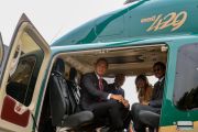 Menteri Koordinator Bidang Infrastruktur dan Pembangunan Kewilayahan Agus Harimurti Yudhoyono (kiri) didampingi Ceo Whitesky group Denon Prawiraatmadja (kanan), CEO Heli Expo Asia Iskandar T Muda. (kedua kiri) dan Ketua Umum APINDO Shinta Widjaja Kamdani (kedua kanan) menaiki Helikopter Bell 429 usai membuka Heli Expo Asia 2025 di Cengkareng Heliport Bandara Soekarno-Hatta, Tangerang, Banten, Rabu (20/8/2025). Pameran yang berlangsung hingga Minggu (24/8) tersebut menghadirkan berbagai model helikopter dari berbagai instansi yang diharapkan dapat mendorong ekonomi baru dan inovasi transportasi udara. ANTARA FOTO/Muhammad Iqbal/foc.