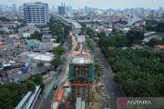 Foto udara proyek pembangunan LRT Jakarta Fase 1B di Jalan Tambak, Jakarta, Jumat (22/8/2025). Progres pembangunan LRT Jakarta Fase 1B per 31 Juli 2025 telah mencapai 61,79 persen dan akan terhubung dari Velodrome hingga Manggarai sepanjang 6,4 km yang ditargetkan selesai dan dapat dioperasikan pada kuartal kedua 2026. ANTARA FOTO/Sulthony Hasanuddin/nz