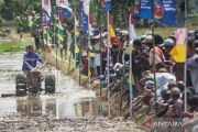 Petani memacu traktornya dalam Lomba Balap Traktor Roda 2 di Lahan Pertanian Kelompok Tani Sumber Makmur, Desa Sumub Lor, Sragi, Kabupaten Pekalongan, Jawa Tengah, Kamis (28/8/2025). Dinas Ketahanan Pangan dan Pertanian Kabupaten Pekalongan menggelar lomba balap traktor yang diikuti sebanyak 20 peserta dari kelompok tani, perwakilan kecamatan, dan pelajar SMK Diponegoro jurusan bidang Pertanian dalam rangka mendukung pencapaian swasembada pangan.ANTARA FOTO/Harviyan Perdana Putra/sgd