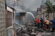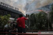 Petugas pemadam kebakaran berusaha memadamkan api yang membakar Gedung DPRD NTB saat aksi unjuk rasa di Mataram, NTB, Sabtu (30/8/2025). ANTARA FOTO/Dhimas Budi Pratama/agr