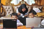 Guru mengawasi pelaksanaan Asesmen Nasional Berbasis Komputer (Gelombang kedua) pelajar kelas V SDN 51 Simpang Kubu Kandang di rumah salah seorang warga di Batang Hari, Jambi, Kamis (25/9/2025). Asesmen yang berlangsung selama dua hari dan diikuti sebanyak 27 siswa tersebut terpaksa dilaksanakan di rumah salah satu guru yang berjarak dua kilometer lebih dari sekolah, disebabkan buruknya jaringan internet di sekolah. ANTARA FOTO/Wahdi Septiawan/nym.