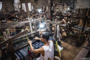 Perajin menyelesaikan pembuatan kain tenun ikat Troso di rumah produksi Kamenz Troso, Desa Troso, Pecangaan, Jepara, Jawa Tengah, Kamis (2/10/2025). Menurut sejumlah perajin setempat, produksi kain tenun khas Jepara yang dibuat secara tradisional dengan Alat Tenun Bukan Mesin (ATBM) itu mencapai sekitar 500 potong per bulan, dengan harga jual mulai Rp75.000 hingga Rp500.000 per potong dan dipasarkan tidak hanya ke berbagai daerah di Indonesia, tetapi juga ke Myanmar, Thailand, dan Australia. ANTARA FOTO/Aprillio Akbar/foc.