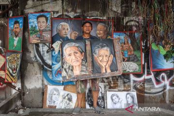 Pelukis Wastro menunjukkan karya lukisannya di trotoar Pintu Besar Selatan, Jakarta, Jumat (3/10/2025). Pelukis jalanan sejak 2010 dan tergabung dalam kelompok pelukis kota itu mampu memproduksi sekitar 10 lukisan per hari dengan harga jual dari Rp350 ribu hingga Rp5 juta serta pernah menerima pesanan dari Presiden Prabowo Subianto. ANTARAFOTO/Muhammad Rizky Febriansyah/YU