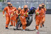 Sejumlah marshal mendorong sepeda motor pembalap Monster Energy Yamaha MotoGP Alex Rins usai terjatuh dalam sesi kualifikasi Q2 MotoGP Indonesia 2025 di tikungan 16 Sirkuit Internasional Pertamina Mandalika, Lombok Tengah, Nusa Tenggara Barat, Sabtu (4/10/2025). Alex Rins meraih posisi keempat dalam kualifikasi Q2 dengan catatan waktu terbaiknya 01 menit 29,336 detik, sementara pembalap Aprilia Racing Marco Bezzecchi yang meraih pole position dengan catatan waktu 1 menit 28,832 detik. ANTARAFOTO/Aditya Pradana Putra/YU
