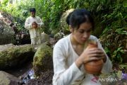 Warga mengikuti prosesi Ngundeur Cai di mata air Cipeundeuy, Ciomas, Kabupaten Serang, Banten, Sabtu (4/10/2025). Tradisi Ngundeur Cai merupakan ritual adat masyarakat Ciomas untuk mengambil air dari tujuh mata air Sungai Cibanten sebagai bentuk ungkapan rasa syukur kepada sang pencipta dan para leluhur. ANTARA FOTO/Muhammad Bagus Khoirunas/agr