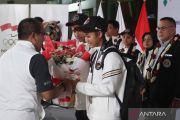 Asdep Olahragawan Elit Kementerian Olahraga Budi Ariyanto Musli (kiri) memberikan karangan bunga kepada dua atlet pencak silat Indonesia peraih medali emas Furgon Habbil Winata (kedua kiri) dan peraih medali perak Qiken Dwi Tata Olifia (kanan) setibanya dari Bahrain di Terminal 3 Bandara Soekarno Hatta, Tangerang, Banten, Rabu (22/10/2025). Pencak silat Indonesia menorehkan sejarah gemilang di Asian Youth Games (AYG) Bahrain 2025 dengan mempersembahkan medali emas pertama bagi tim Indonesia dan menjadi medali emas pertama pencak silat di ajang AYG yang diraih Furgon Habbil Winata di kelas 51-55 kg putra dan medali perak oleh Qiken Dwi Tata Olifia. ANTARA FOTO/Muhammad Iqbal/YU