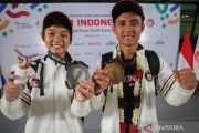 Dua atlet pencak silat Indonesia peraih medali emas Furgon Habbil Winata(kanan) dan peraih medali perak Qiken Dwi Tata Olifia (kiri) menunjukkan medali setibanya dari Bahrain di Terminal 3 Bandara Soekarno Hatta, Tangerang, Banten, Rabu (22/10/2025). Pencak silat Indonesia menorehkan sejarah gemilang di Asian Youth Games (AYG) Bahrain 2025 dengan mempersembahkan medali emas pertama bagi tim Indonesia dan menjadi medali emas pertama pencak silat di ajang AYG yang diraih Furgon Habbil Winata di kelas 51-55 kg putra dan medali perak oleh Qiken Dwi Tata Olifia. ANTARA FOTO/Muhammad Iqbal/YU