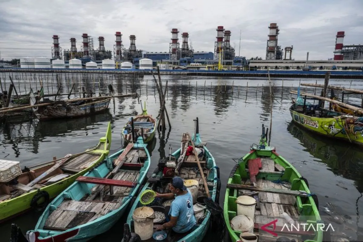 Nelayan memindahkan ikan hasil tangkapan dengan latar belakang Pembangkit Listrik Tenaga Gas dan Uap (PLTGU) Tambaklorok di Semarang, Jawa Tengah, Sabtu (15/11/2025). Kementerian Energi dan Sumber Daya Mineral (ESDM) mencatat terdapat tren peningkatan produksi listrik dari energi baru dan energi terbarukan (EBT) atau listrik bersih dari 3,72 Terawatt jam (TWh) pada Januari 2025 menjadi 37,48 TWh pada Oktober 2025. ANTARA FOTO/Aprillio Akbar/sgd