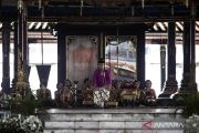 Kanjeng Gusti Pangeran Adipati Anom (KGPAA) Hamangkunegoro Sudibyo Rajaputra Narendra Mataram atau Gusti Purbaya (tengah) duduk saat Jumenengan Dalem Nata Bhinayangkare atau upacara penobatan raja baru bergelar atau Sampeyan Dalem Ingkang Sinuhun Kanjeng Susuhunan (SISKS) Pakubowono XIV di Keraton Kasunanan Surakarta Hadiningrat, Solo, Jawa Tengah, Sabtu (15/11/2025). Upacara adat tersebut digelar untuk mengumumkan Hamangkunegoro sebagai pewaris tahta Keraton Surakarta Hadiningrat menggantikan ayahnya, Pakubuwana XIII yang wafat Minggu (2/11/2025). ANTARAFOTO/Maulana Surya/sgd