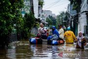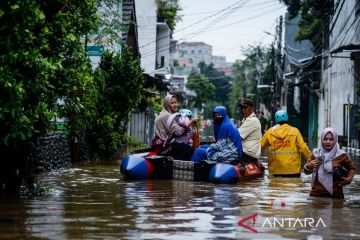 Petugas damkar mengevakuasi warga menggunakan perahu karet saat banjir di perumahan Pondok Maharta, Kota Tangerang Selatan, Banten, Selasa (18/11/2025). Badan Penanggulangan Bencana Daerah (BPBD) Kota Tangerang Selatan mencatat sebanyak 17 wilayah tergenang banjir dengan ketinggian mulai dari 5 - 75 sentimeter yang disebabkan tingginya intensitas hujan. ANTARA FOTO/Putra M. Akbar/tom.