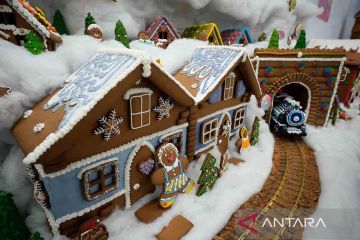Deretan rumah-rumah Polandia dan kereta dari kue jahe dan gula berwarna dipamerkan dalam Gingerbread City di Warsawa, Polandia, Rabu (19/11/2025). ANTARA FOTO/Xinhua/Jaap Arriens/rwa.
