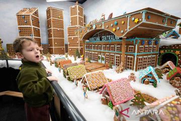 Seorang anak mengamati deretan rumah-rumah Polandia dari kue jahe dan gula berwarna dalam pameran Gingerbread City di Warsawa, Polandia, Rabu (19/11/2025). ANTARA FOTO/Xinhua/Jaap Arriens/rwa.
