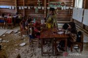 Guru Armani memeriksa tugas pembelajaran siswa di SD Negeri 2 Sorongan kelas jauh Batu Payung, Cibaliung, Pandeglang, Banten, Kamis (20/11/2025). Sebanyak 23 siswa dan satu guru yang mengajar di daerah terpencil Kabupaten Pandeglang tersebut hanya memiliki satu ruang belajar yang rusak parah untuk menampung siswa dari kelas satu hingga enam. ANTARA FOTO/Muhammad Bagus Khoirunas/YU