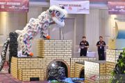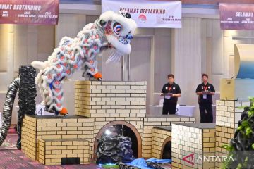 Tim Barongsai kontingen Jawa Tengah beraksi saat mengikuti kategori Barongsai Tradisional dalam Kejuaraan Nasional Barongsai 2025 di Denpasar, Bali, Sabtu (22/11/2025). Kejurnas Barongsai yang melombakan 12 kategori tersebut diikuti sekitar 600 peserta dari 18 provinsi. ANTARA FOTO/Fikri Yusuf/nym.