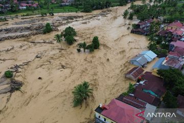 Foto udara limpahan banjir bandang di kawasan Pasar Baru, Padang, Sumatera Barat, Jumat (28/11/2025). Banjir bandang terjadi pada Jumat (28/11/2025) dini hari dan semakin meluas akibat jebolnya bendungan Gunung Nago di Pauh, sehingga mengakibatkan jembatan putus, sejumlah rumah rusak dan warga mengungsi. ANTARA FOTO/Iggoy el Fitra/nz
