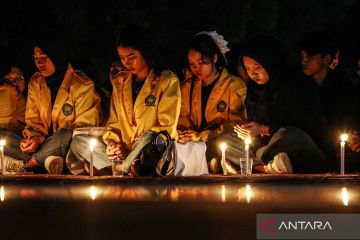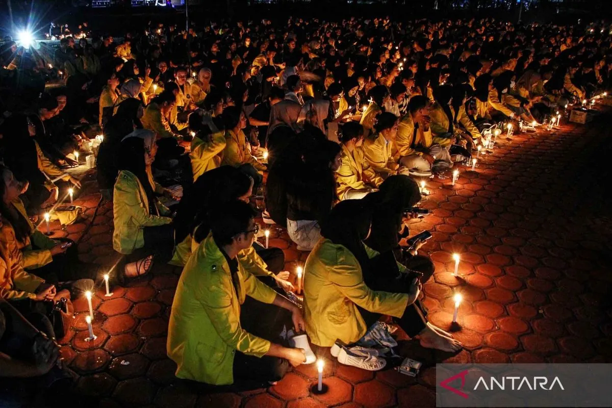Sejumlah mahasiswa melakukan doa bersama saat aksi solidaritas untuk korban bencana di Universitas Palangka Raya, Kalimantan Tengah, Kamis (4/12/2025). Aksi penyalaan lilin oleh mahasiswa tersebut sebagai bentuk kepedulian dengan melakukan penggalangan dana dan doa bersama untuk korban bencana banjir di Sumatera Utara, Sumatera Barat, dan Aceh. ANTARA FOTO/Auliya Rahman/YU