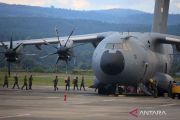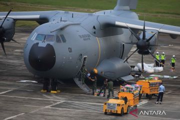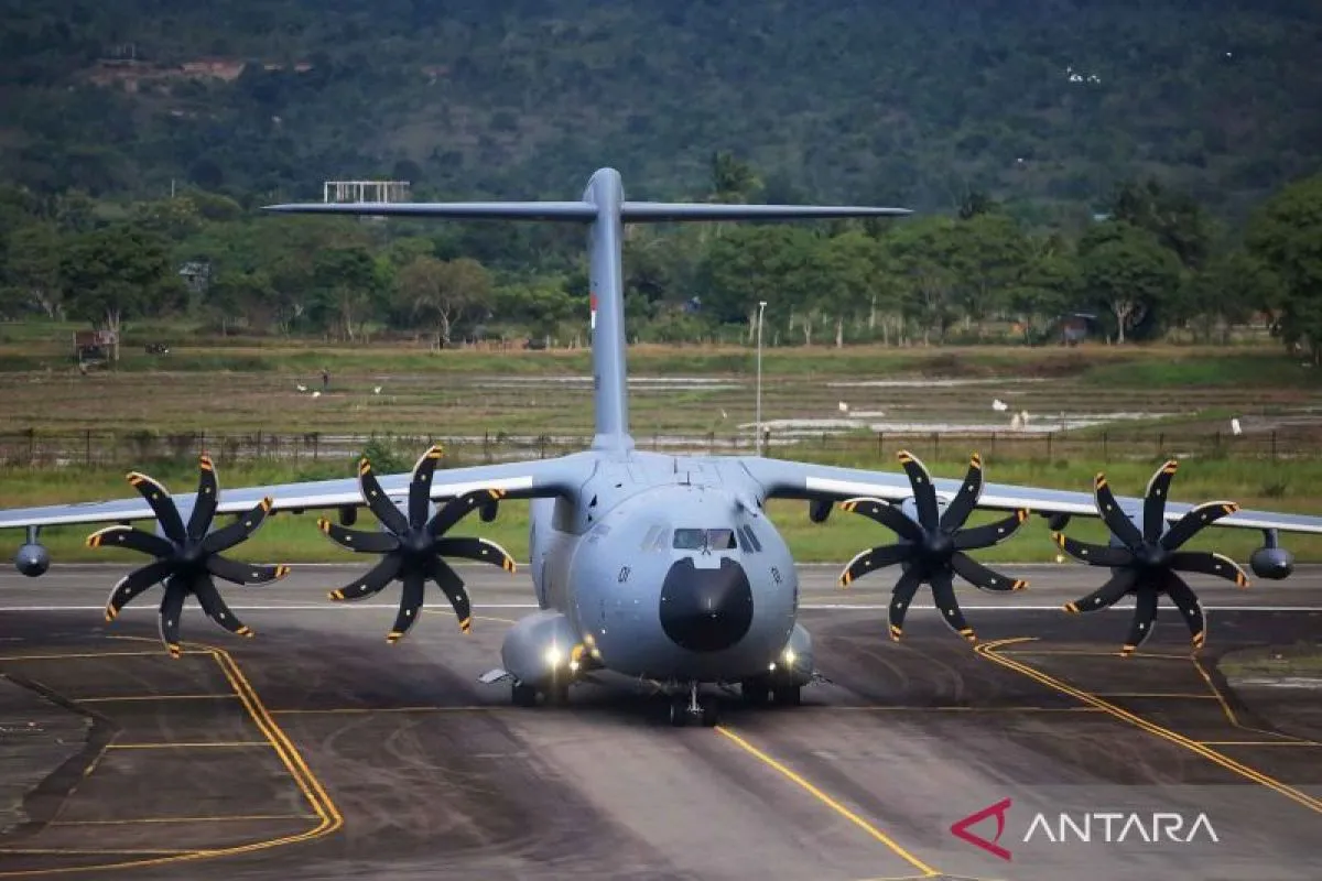 Pesawat Airbus A 400 TNI Angkatan Udara mengangkut bantuan logistik bencana banjir mendarat di Bandara Internasional Sultan Iskandar Muda, Blang Bintang, Kabupaten Aceh Besar, Aceh, Kamis (4/12/2025). Pesawat Airbus TNI Angkatan Udara tersebut mengangkut sebanyak 24ton logistik terdiri dari makanan saji, bahan pangan, keperluan bayi, pakaian dan dukungan kesehatan berupa obat-obatan serta perangkat komunikasi untuk pemulihan penanganan wilayah yang terdampak bencana banjir bandang dan longsor di Aceh. ANTARA FOTO/Ampelsa/YU