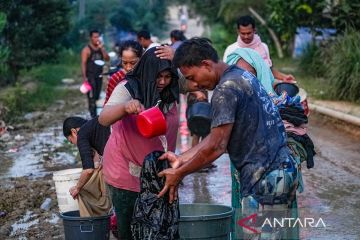 Sejumlah warga menggunakan air parit untuk mencuci pakaian di Rantau, Kabupaten Aceh Tamiang, Aceh, Jumat (5/12/2025). Setelah sepekan bencana banjir bandang, warga setempat masih belum mendapatkan akses air bersih sehingga terpaksa menggunakan air parit untuk kebutuhan MCK mereka. ANTARA FOTO/Erlangga Bregas Prakoso/rwa.