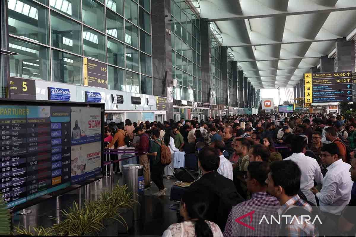 Ribuan pelancong mengantre di kios tiket IndiGo untuk memeriksa status penerbangan mereka di Bandara Internasional Kempegowda di Bengaluru, India, Jumat (5/12/2025). Ribuan penumpang terlantar di bandara-bandara besar di India usai IndiGo membatalkan lebih dari 1.000 penerbangan, memicu krisis operasional yang belum pernah terjadi sebelumnya. ANTARA FOTO/REUTERS/Priyanshu Singh/rwa.