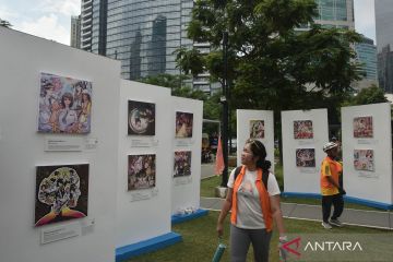 Peserta mengamati karya animasi yang dipamerkan saat kampanye akhiri kekerasan digital terhadap perempuan dan anak di Kuningan, Jakarta Selatan, Sabtu (6/12/2025). Kegiatan tersebut menampilkan pameran foto, pameran karya animasi, senam dan aksi bersepeda bebas emisi yang bertemakan aspirasi kolektif untuk tidak memberikan ruang toleransi terhadap perilaku yang berdampak buruk. ANTARA FOTO/Fakhri Hermansyah/agr